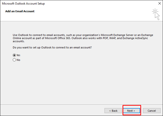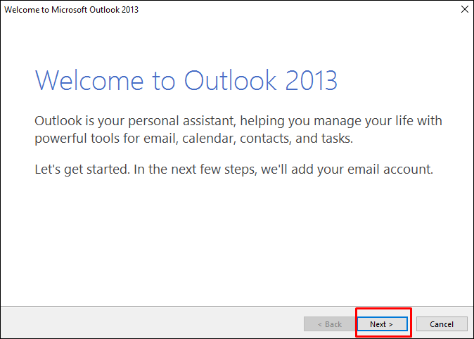 Outlook’u ilk defa açtığınızdan dolayı sizi karşılayan bir pencereyle karşılaşacaksınız. Kurulumunuzu başlatmak için Next’e (İleri) tıklayın.