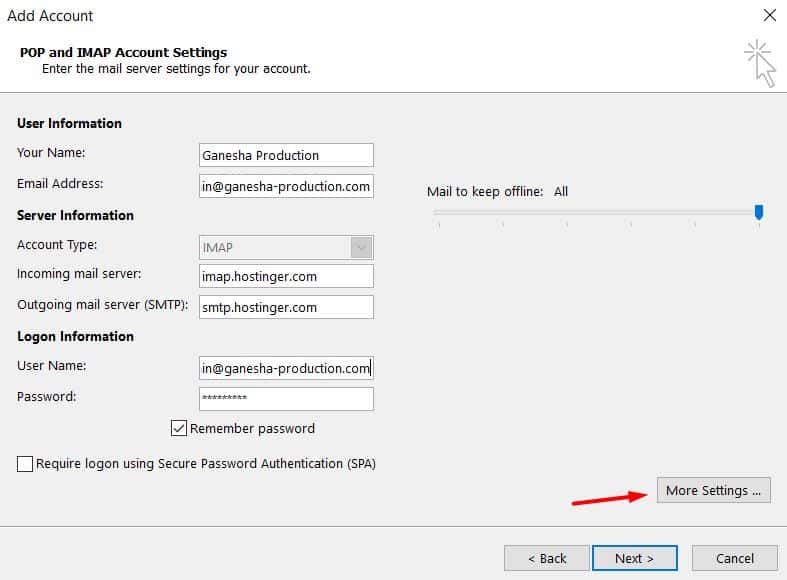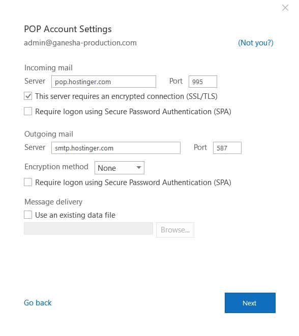 Aşağıdaki pencere göründüğünde kontrol panelinizden edindiğiniz bilgilerle formu doldurun ve ilerlemek için Next (İleri) tuşuna basın. E-posta adresinizin şifresini girin ve Connect’e (Bağlan) basın.