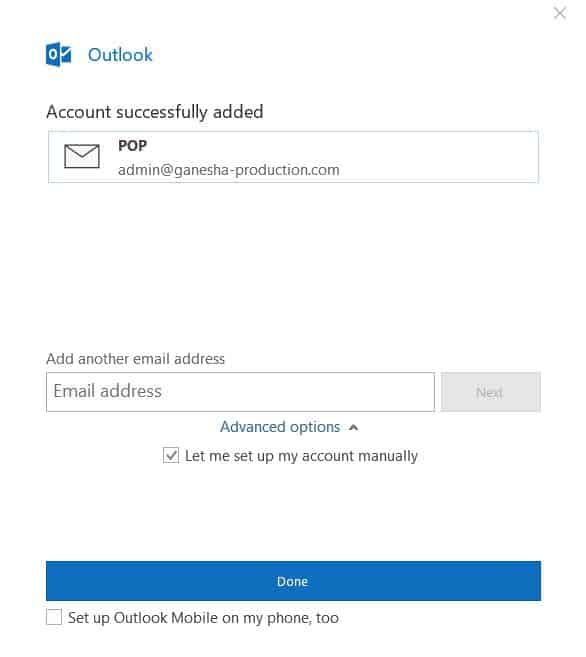 Seçiminize göre listede POP veya IMAP görünecektir. Daha sonra ise Done’a (Bitti) tıklayın ve Outlook 2016 arayüzüne geçin.