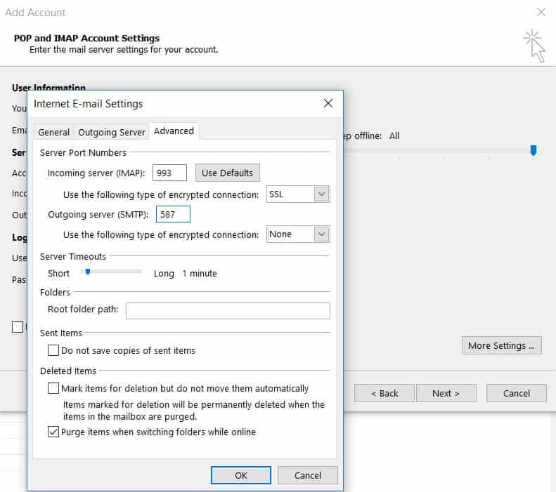 Daha sonra ise Advanced (Gelişmiş) sekmesine geçin. Sunucu port numaralarını ve şifreli bağlantıları aşağıdaki gibi ayarlayın ve OK (Tamam) butonuna tıklayın.