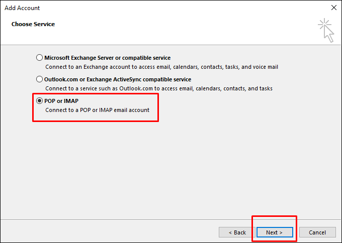 Sıradaki pencere açıldığında POP ve IMAP arasında bir seçim yapın.